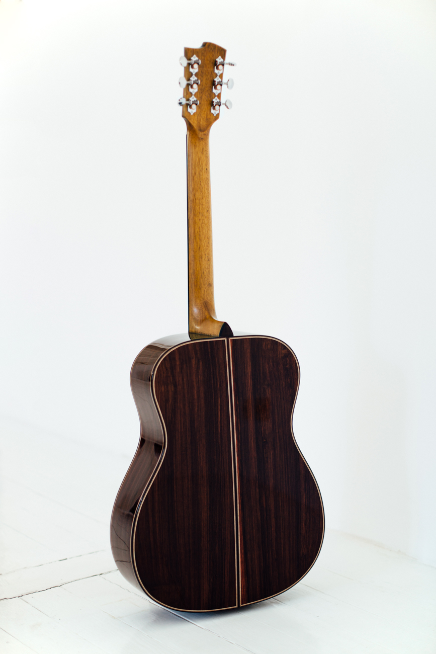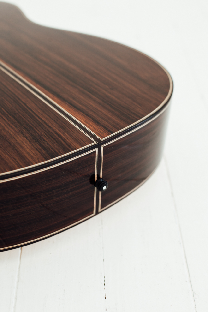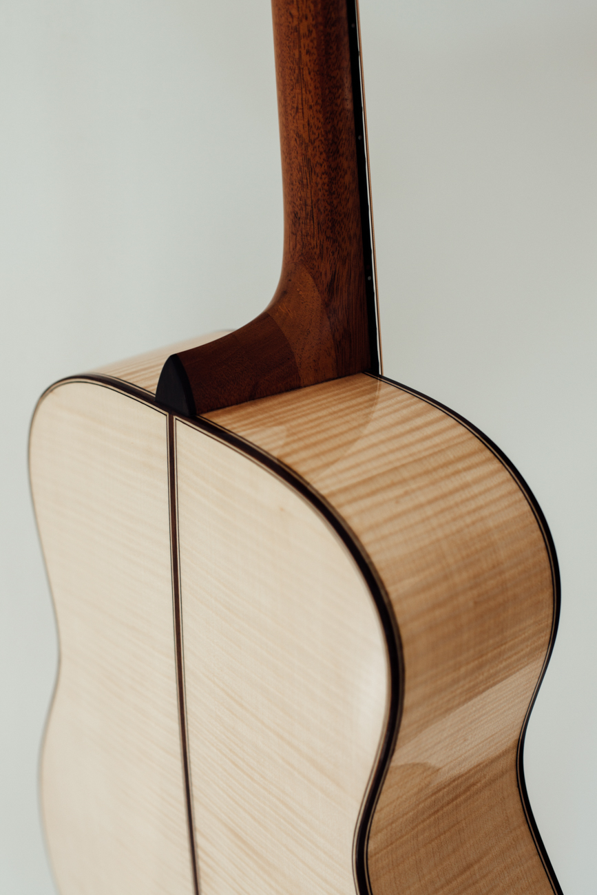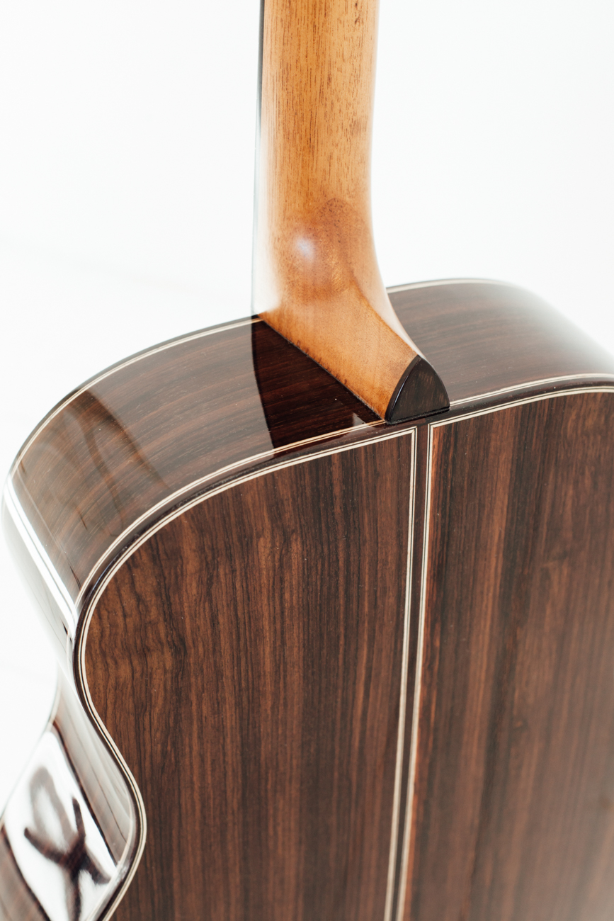 Meine Eigenentwicklung Standard ist mit ihrem mittelgroßen Korpus, ihrer weiten Taille und der klaren Linienführung der perfekte Allrounder in jeder Stilstik. Ausschließlich beste, luftgetrocknete Hölzer, zusammen mit einer leichten Deckenbeleistung unterstützen die Tonentfaltung für sensibles Fingerpicking und bieten Sustain und Lautstärkereserven für Solospiel und als Begleitinstrument.